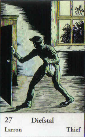De Dief Deze kaart staat voor oneerlijkheid, diefstal, inbraak. Een verlies. Materieel verlies of verlies in de liefde, verlies van status, enz... Verlies is niet leuk. Het hoort bij het leven, maar het is op geen enkele manier te zien als een positieve ervaring. Weet dat je niet kunt vasthouden wat verloren is. Verlies en acceptatie horen bij elkaar. Pas als je kunt accepteren dat je iets of iemand verloren hebt, open je de deur naar nieuwe mogelijkheden. Sluit af wat je kwijt bent. Dat is waar deze kaart je toe oproept.